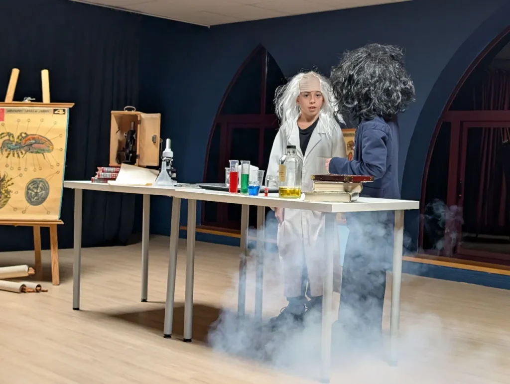 La mañana comenzó con un acto inaugural que reunió a alumnos y profesores en el salón de actos. Primero, los estudiantes de 5º y 6º de Primaria representaron un breve teatro científico, dando vida a figuras clave de la historia de la ciencia como Einstein, Darwin, Galileo y Newton. Esta obra fue dedicada a la Sita Elena, antigua profesora de física y química que tanta huella ha dejado en los alumnos de este colegio.